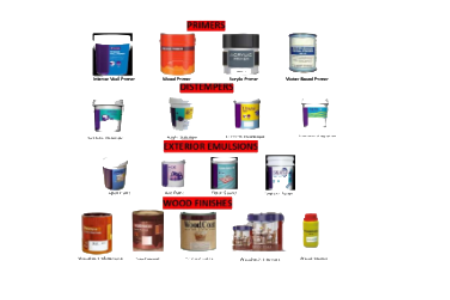 - Primer: Red Oxide Primer, Cement Primer,Zincromate Primer, Metal primer , wood Primers